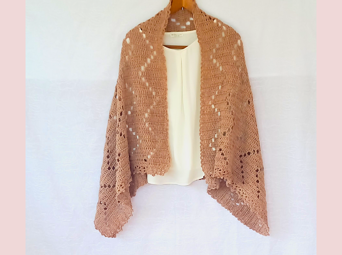 春先、夏の冷房対策、秋冬はもちろん「年中使えたらいいな」をウール混の毛糸で編みました。