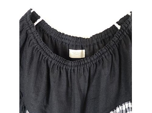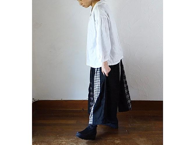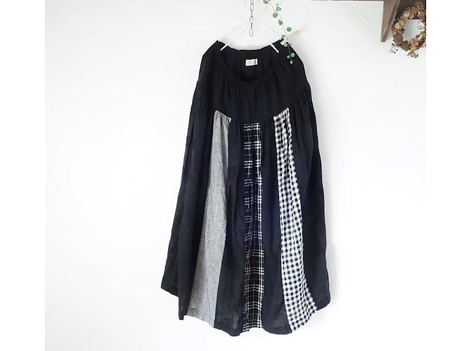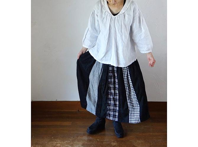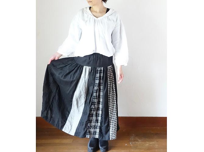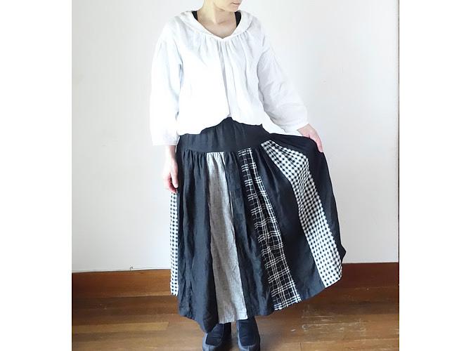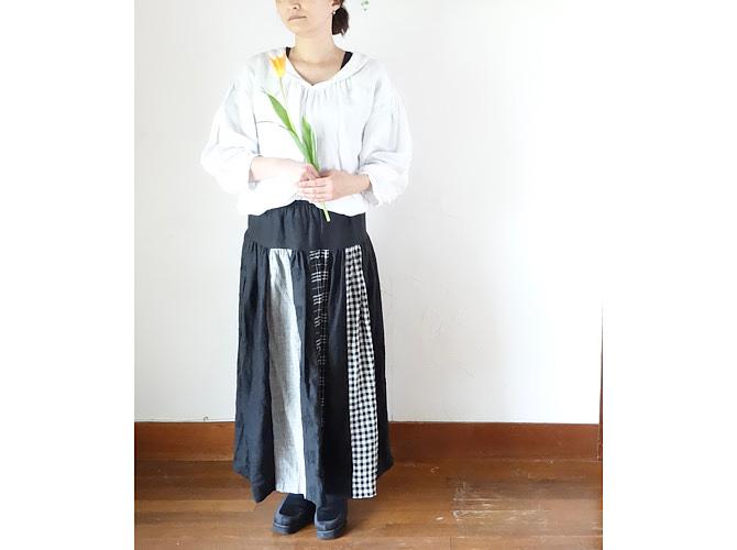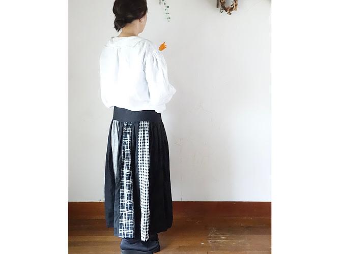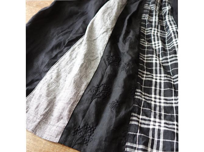 黒無地の生地、刺繍が施された生地、大小のギンガムチェック、タータンチェックなど黒系のリネン生地を接ぎ合わせたので、様々な表情を楽しめるスカートになりました。