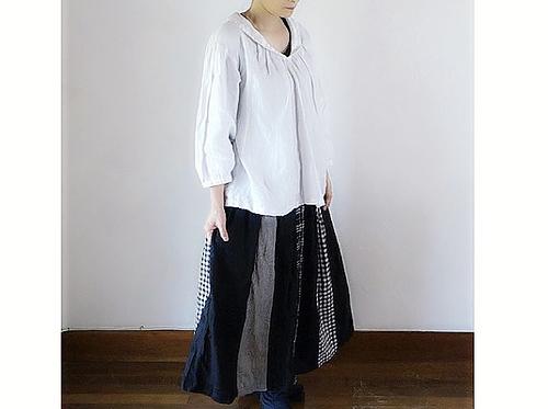 黒系の5種類のリネン生地を接ぎ合わせて作った、春らしくひらひらと軽くて動きのあるスカートを仕立てました。