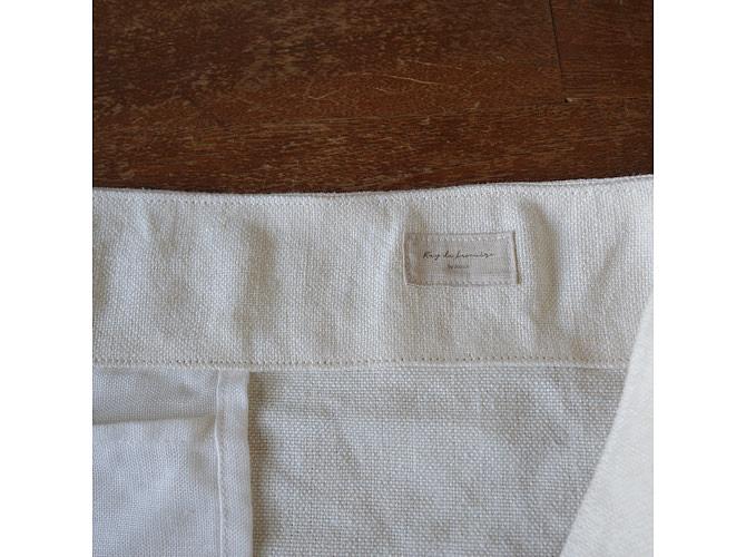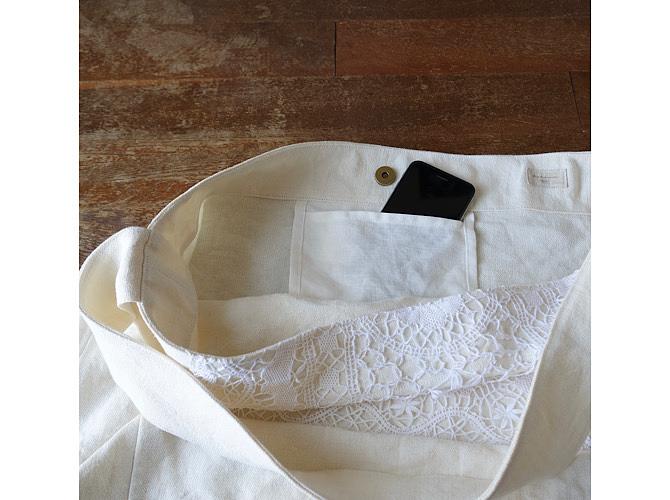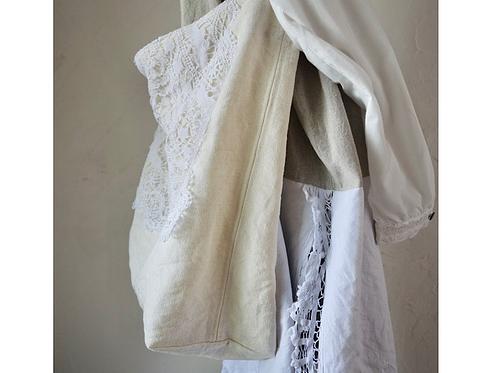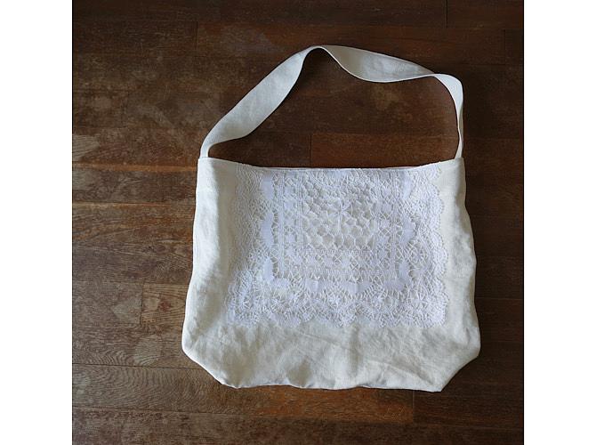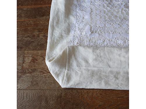 オフ白のくったりと優しい表情を見せてくれるリネン帆布に、レース編みを縫い付けました。
