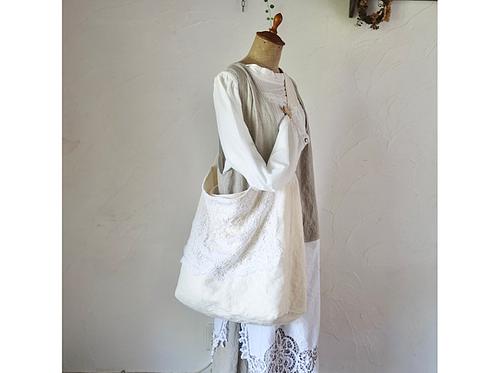 ボビンレースを贅沢に縫い付けた大きめショルダーバッグです。