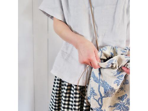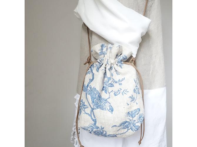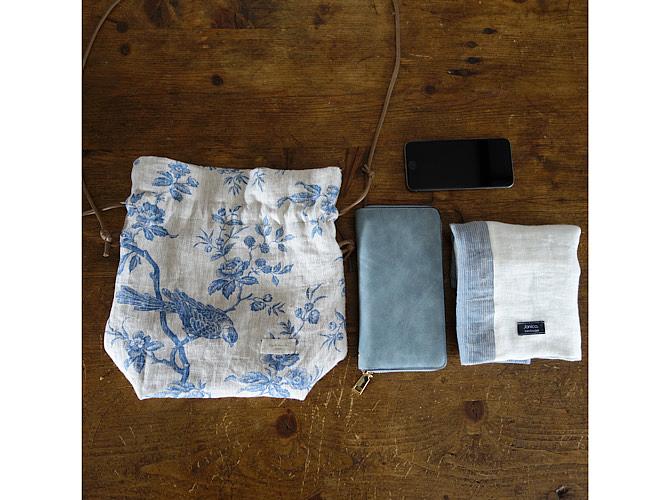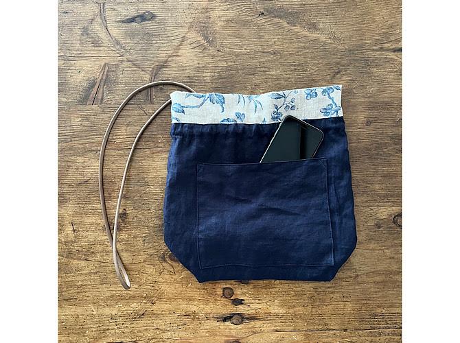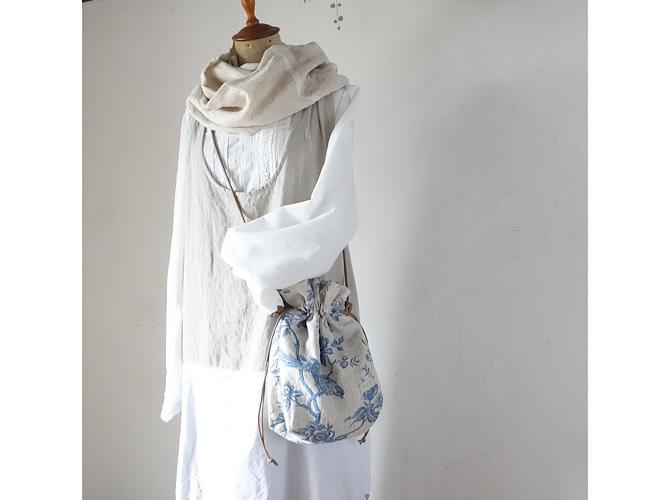 ざっくり目のフレンチリネンで巾着ポシェット(ショルダーバッグ)を制作しました。